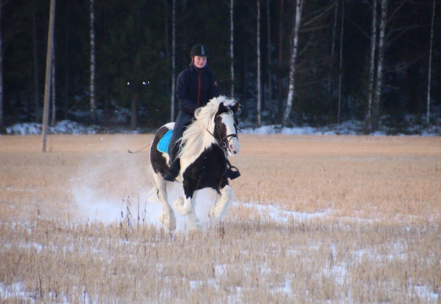Laukannostoista yritin työstää teräviä, ja jälleen se onnistui aika kivasti! Saatiin muutama oikein kiva nosto, vaikka toki mukana oli niitä sekamelskoja missä vaan ajauduttiin laukkaan. Mutta ihan selvää kehitystä on tässäkin tullut. Kaiken lisäksi laukka tuntui olevan heti täysin hallinnassa ja Masa meni ajoittain hyvinkin rauhassa. Kerran se pääsi siirtymään itse raviin, mutta yllätyin miten nopeasti se vastasi takaisin pohjeapuun ja nosti laukan uudelleen.
